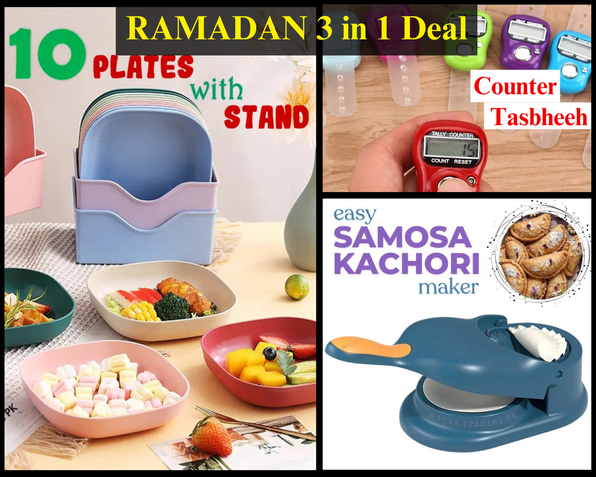 ✨ Ultimate Ramadan 3-in-1 Deal – Samosa Maker, Plastic Plates Set & Counter Tasbeeh! 🌙